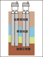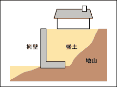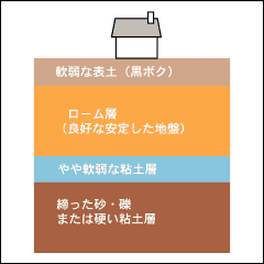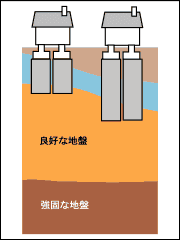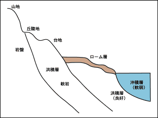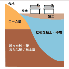 住宅を新築する場合、全く知らない土地に建てることがよくあります。その際、その土地が以前、どのような土地であったかを知ることは大切なことです。仮にそこが田んぼや畑であった場合、大きな地震等によって家が傾いたり沈下したりすることがあるからです。こうした土地では知らず知らずのうちに家が傾いて、ドアが閉まらなかったり、壁にひびが入ったりしてきますので、注意が必要です。最近、社会問題となっている欠陥住宅も土地(住宅地盤)の悪さかが原因となって発生することが少なからずあります。この原因をもう少し詳しく見ていくと、そこには軟弱地盤という問題が隠れているのです。軟弱地盤軟弱地盤とは文字どおり軟弱な地盤のことで、例えば水田や川の近く、低地、谷地など、水の溜まりやすい場所に多く見られます。つまり、軟弱とは水分と空気を多く含んだ土地のことを言い、このような場所に家を建てると家の重さで土中の水分が抜けて、その分だけ建物が沈下してしまいます。従ってこうした場所に家を建てる際は、必ず地盤調査をすることが大切です。調査費用は数万円、工事は数十万円ですが、将来住めなくなって取り壊すかもしれないことを考えると、決して高いとは言えないでしょう。軟弱地盤をつくる水と空気地盤は土と水と空気で構成されています。この中で地盤の強弱を決定するのは水と空気で、特に水の含有率が多くなるほど軟弱度の高い土地となります。掘り起こされた土地が柔らかいのは隙間(空気)が多いからであり、そこに水が染み込むと地盤はさらに軟弱化します。こうした地盤の上に家を建てる場合、一般的には締固めという作業を行います。これは土の中の空気を押し出して土中の隙間を小さくし、土の粒子間を密にして地盤を硬くする方法です。締固めが不十分だと雨が染み込んで地盤が緩み、酷い場合は家が傾いてしまいます。地震の揺れを増幅する軟弱地盤硬い地盤に比べて軟弱な地盤では、木造住宅を振動させやすい周波数が実に25倍にも達するという報告が京都大学防災研究所から出されています。震度7を計測した阪神大震災ではこの増幅作用が働きひときわ大きな揺れとなったと考えられています。震度7の大きな揺れを記録した「震災の帯」と呼ばれる一帯は、まさに軟弱地盤の集中する地域でもありました。地盤を知ろう同じように平らに見える宅地でも、場所によってその地盤構造が大きく違います。軟弱地盤なのに有効な対策のないまま家を建てると、不揃いに沈下するいわゆる"不同沈下"が起こります。夢にまで見た新居が傾いてしまわないために、地盤を知り、対策を立てることは非常に大切なことです。 良好な地盤構造の例 (台地) 軟弱な地盤構造の例 (谷地)軟弱地盤を見つけよう不同沈下を引き起こす軟弱地盤を見分けるには、専門業者に地盤調査を実施してもらうのが最も良い方法ですが、基本的な知識はもっておきましょう。 −軟弱地盤は低地に多い 雨水や地下水が集まるのは低地です。雨水は背後の高台から微細な泥を運んでくるため、何千年という長い年月の間に、厚く堆積して軟弱層を形成しています。軟弱地盤の多い場所・ 坂道の下りきったところは低地・ 水路や川、池のそばは低地・ 水に関係のある漢字を使う地名は低地が多い(池、渡、流、湘、島、崎、泉、谷、田、鷺、萩など) 地形断面概念図−盛土は要注意 地盤の弱い低地には盛土がかかせません。しかし1mの盛土は建物よりも重く、土の重さだけで圧密沈下しかねません。また建設廃材(ガラなど)が混入されている場合は、地盤沈下の新たな火種となります。一方、本来は地盤良好な高台の斜面造成地も、図のように工作物沿いの掘削埋め戻し地盤が締固め不十分だと、バランスが悪くなり注意が必要です。 ◆軟弱地盤対策地盤調査の結果に基づいて、軟弱度合いに応じた基礎仕様あるいは地盤補強工法を決定します。基礎仕様は一般的に次の5つがあります。1. 良好地盤の場合の場合 「標準の布基礎」1m3当たり5トン以上まで耐えられる「地耐力」があると診断されれば、この標準の布基礎を使う。 2. やや軟弱な地盤の場合 「底版を広げた布基礎」地盤調査により、1m3当たり3トン以上5トン未満の「やや軟弱」な地盤と診断された場合は基礎形状を変える必要がある。方法としては、基礎と地盤面が接するベースの幅を広げる。接地面が増えれば荷重が分散されるので、建物が軽くなるのと同じ効果が得られて沈下をより小さくすることができる。 3. 軟弱地盤の場合 「ベタ基礎仕様」ベースの幅で対応できるのは地耐力1m3当たり3トンが限度。2〜3トンまでの「軟弱」地盤の場合は床下全面にコンクリートを打つ「ベタ基礎」にして不同沈下を均等化させる方法がある。ただし、沈下が大きくなるので設計上注意が必要である。 4. 超軟弱地盤の場合 「特殊セメントを用いた地盤改良」地耐力1m3当たり2トン以下の「超軟弱」と診断されても、地盤補強工事を施せば家は