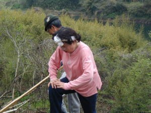 桜をかついでみんなが集まった。野焼きをした傾斜地、 竹の根が張ってて大変だったけど、頑張ってみんなで植えました・・・・ 桜60本、これから風雪に耐えて大きく育ってくれるかな? 期待してるよ〜〜 (2002/04/07)