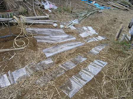 弥生村の竪穴住居が出来たのは2年前の3月、萱も大分傷んでしまいました。みんな忙しいという事で地元も方々に手伝ってもらって屋根の葺き変えが進行中です。春はそこまで来ています。ウグイスの幼い鳴き声が聴こえて来そうな春の写真です。山桜がちらほら咲いていますね。