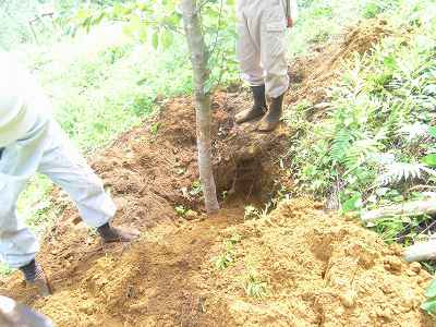 台風4号で根こそぎ倒れた15本の瀕死状態の桜達を蘇生する為に造園屋さんを頼んで植え替えました。今は時期が悪い事、根がもぎ取れた状態で倒れている事などから、造園屋さんもこれらを再生させるのは難しそうな様子。でも、費用はかかっても最善の努力だけはすべしと前田村長も奮発し、蘇生措置をほどこす事に決断しました。一日目、前田村長も造園屋さんを手伝ったのですが、その日は天気も良くサウナに入っているくらいに汗が全身からしたたり落ちるほどで、水分を取ってもすぐのどがカラカラになりました。造園屋さんの提案で、暑い時に熱いお茶を飲んだら元気が出ました。